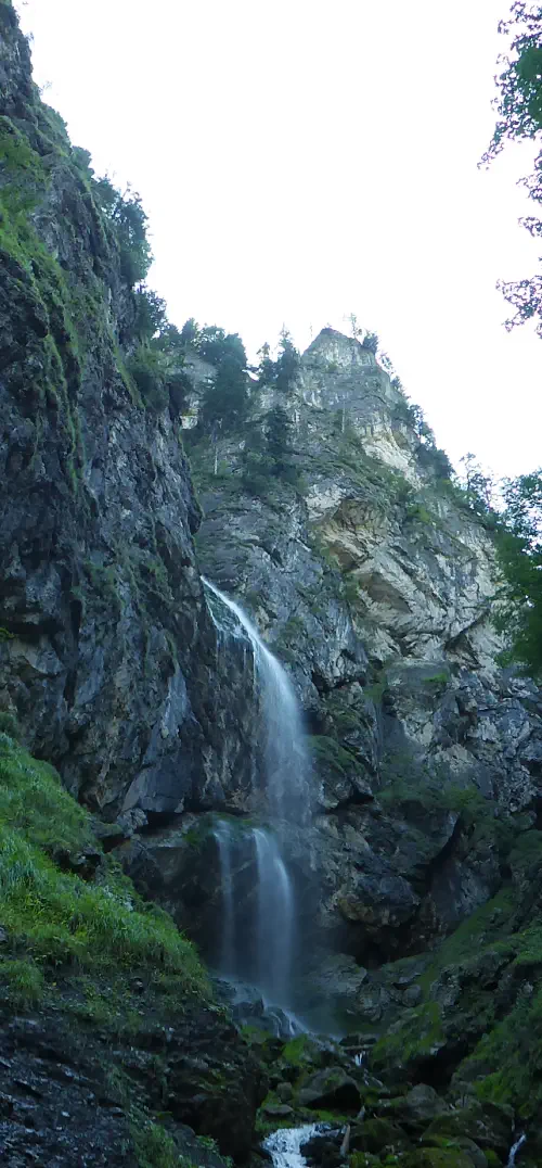 Mitten aus einer Wand im Biospärenpark Großes Walsertal fließt ein mächtiger Wasserfall.